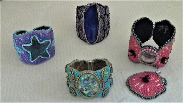 I design and make hand made bead embroidery bracelets. I have a few listed in my ebay store but I also have several not listed that I would like to sell. They are all one of a kind designs and consist of leathers, pearls, rhinestones, glass beads, gemstones, etc. There is alot of work that goes into designing planning, gauging, materials and construction to a finished bracelet. So the prices are rather high. If anyone is interested in seeing what I have you can contact me by email or phone dpurcell1@triad.rr.com or phone 336-473-1538 (cell). You can also find me on eBay as https://www.ebay.com/usr/dopurcell2012 or just key in donna purcell on ebay.. You can see a few of my designs in my ebay store. I have also included photos below of my latest designs.